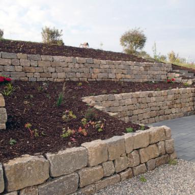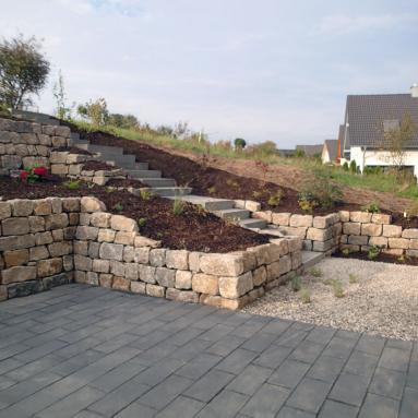Material: Mauern Muschelkalk, Granitstufen, Pflaster MultiTec, Oberrheinkies 8/16 (auf Wabenplatten und in Teilbereichen mit Stauden bepflanzt), Oberboden, Stauden, Sträucher, Bodendecker und Rindenmulch