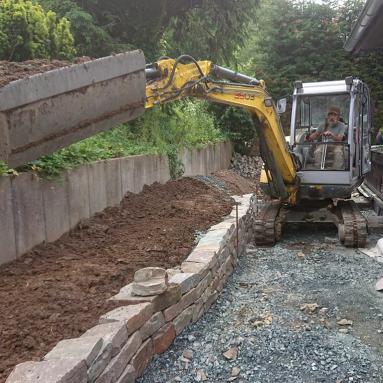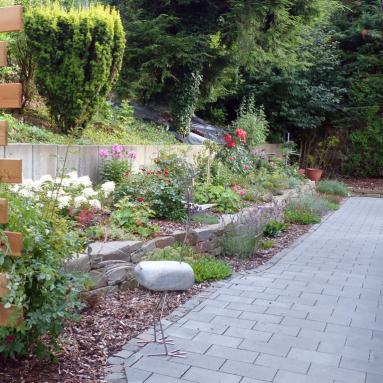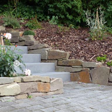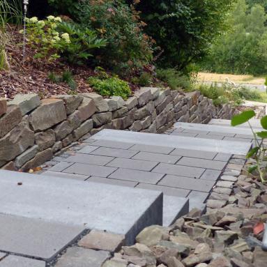 Grauwacke Mauer, Einfassung 9/11 Grauwacke-Natursteinpflaster, Pflaster Kann MulTec 20/10/8 Grau, Stufen Kann Beton Grau, Spritzschutzstreifen Grauwacke-Grobschlag